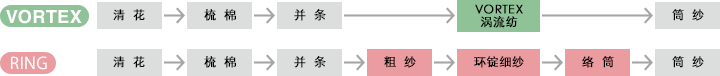 “VORTEX涡流纺”是利用空气的涡流进行纺织的技术。跟随空气流动的纤维形成独特构造,因此赋予了纱线多样的功能性。