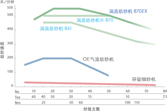 2011年首次亮相的VORTEX III 870实现了500米/分钟的最高纺纱速度。此后,我们不断切实积累高速纺纱的成果和客户的信任,实现了870 EX最高达550米/分钟的纺纱速度。