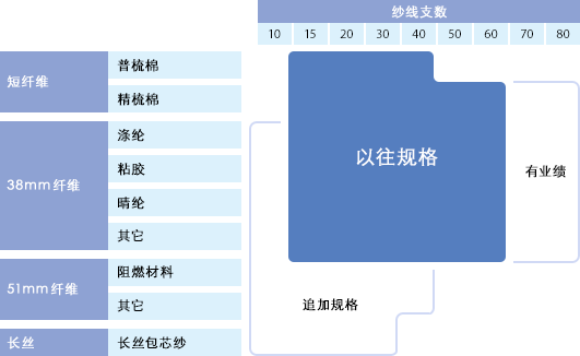 结合至今为止的经验和客户的反馈意见,我们积累了各种材料和支数的纺纱业绩。目前,作为单一机台对应着最广泛的原料种类以及纱支范围的生产。